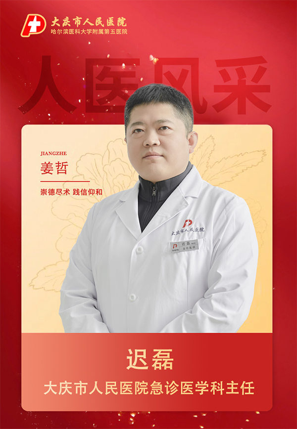 迟磊,主任医师,1999年毕业于哈尔滨医科大学临床医学系,现任大庆市人民医院急诊医学科主任。发表论文十余篇,获市级科学技术进步奖二等奖2项、三等奖1项。